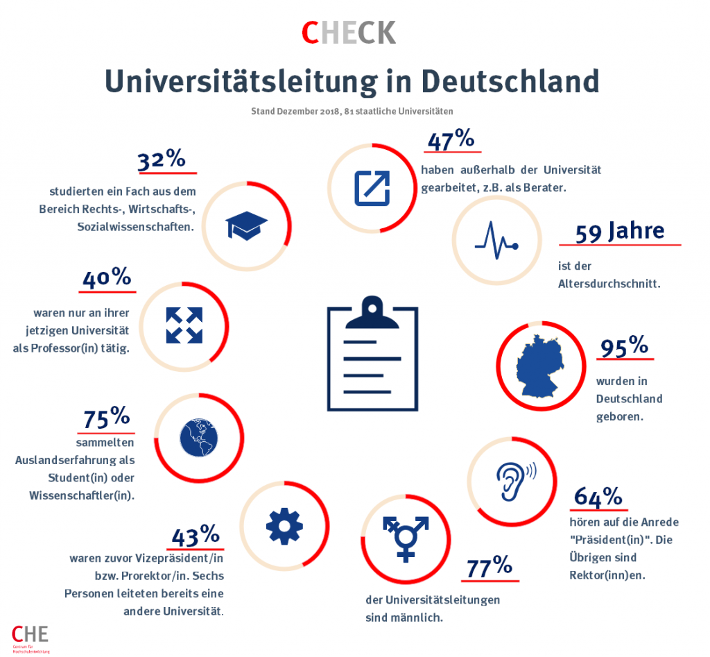 Lebensläufe Universitätsleitungen Keine einzige Universitätsleitung stammt aus Ostdeutschland 7. Februar 2019 von Isabel Roessler Hochschulmanagement, Hochschulpolitik, Studium & Lehre Die typische Universitätsleitung ist männlich, deutsch und 59 Jahre alt. Zu diesem Ergebnis kommt eine Analyse des CHE Centrum für Hochschulentwicklung. Die Auswertung der Lebensläufe von Universitätspräsident(inn)en und – rektor(inn)en zeigte zudem ein starkes regionales Gefälle: Jede dritte Führungskraft stammt aus Nordrhein-Westfalen, keine einzige aus einem ostdeutschen Bundesland. Im Durchschnitt sind die Rektor(inn)en oder Präsident(inn)en an staatlichen Universitäten 59 Jahre alt. 95 Prozent der Universitätsleitungen kommen aus Deutschland, lediglich bei vier Personen liegt der Geburtsort im Ausland. Rund ein Drittel stammt aus Nordrhein-Westfalen. Keine Führungskraft einer staatlichen Universität wurde dagegen in Ostdeutschland geboren. „Es ist nur eine Momentaufnahme – aber 30 Jahre nach der Wiedervereinigung ist eine Universitätslandschaft ohne Top-Führungskräfte mit ostdeutschen Wurzeln schon bemerkenswert“, urteilt Frank Ziegele. Der CHE Geschäftsführer wünscht sich dabei generell eine größere Heterogenität auf allen Ebenen: „Bei den studentischen Bildungsbiografien ist die Vielfalt auf dem Campus angekommen, warum nicht auch mehr Vielfalt in den Führungspositionen?“ Ein klares Bild zeigt sich auch noch beim Geschlechterverhältnis: Drei Viertel aller Universitäten werden aktuell von Männern geleitet. Zuvor war die Quote noch höher, denn jede vierte Universitätspräsidentin oder – rektorin ist erst 2018 neu ins Amt gekommen. Deutlich differenzierter sind die Ausbildungswege der Führungskräfte. „Unter den heutigen Hochschulleitungen finden sich neben Juristen auch Sportwissenschaftler und ehemalige Lehramtsstudenten“, merkt Studienleiterin Isabel Roessler an. Positiv neben dieser biografischen Fächervielfalt bewertet die Senior Projektmanagerin beim CHE auch die Aufstiegsmöglichkeiten innerhalb der Hochschullandschaft: „Die Zeiten, bei denen man nach Führungsjobs an der Hochschule wieder ins zweite Glied zurücktreten musste, scheinen vorbei zu sein. Jede zweite Hochschulleitung hat bereits zuvor Erfahrungen als Vizepräsident oder Vizepräsidentin im Präsidium gesammelt.“ Sechs Personen haben bereits zuvor eine andere Universität geleitet. Ziel der CHE Analyse ist es, Transparenz über die Situation der Führungskräfte an deutschen Hochschulen zu schaffen. „Universitäten zählen oft zu den größten Arbeitgebern einer Stadt oder Region. Auch deshalb tragen Hochschulleitungen eine mindestens so große Verantwortung wie CEOs in Unternehmen“, konstatiert CHE Geschäftsführer Frank Ziegele. Deshalb sei es wichtig, die speziellen Karrierewege im Hochschulmanagement zu analysieren und besser zu verstehen. Im Herbst 2019 werden die vorliegenden Daten vom CHE um Führungskräfte von Fachhochschulen und Hochschulen für angewandte Wissenschaften ergänzt. Über diese Publikation Autorin der Publikation „CHECK – Universitätsleitung in Deutschland“ ist Isabel Roessler. Die mehr als 2.500 analysierten Daten stammen aus im Netz veröffentlichten Lebensläufen der Hochschulleitungen, ergänzt durch Nachfragen bei Präsidien und Rektoraten. Enthalten sind die Daten aller 81 öffentlich-rechtlichen Universitäten – ausgenommen Pädagogische Hochschulen und Kunstuniversitäten. Stand der Erhebung ist Dezember 2018. Die Publikation zum Download Grafiken aus der Publikation zum Download bei Flickr