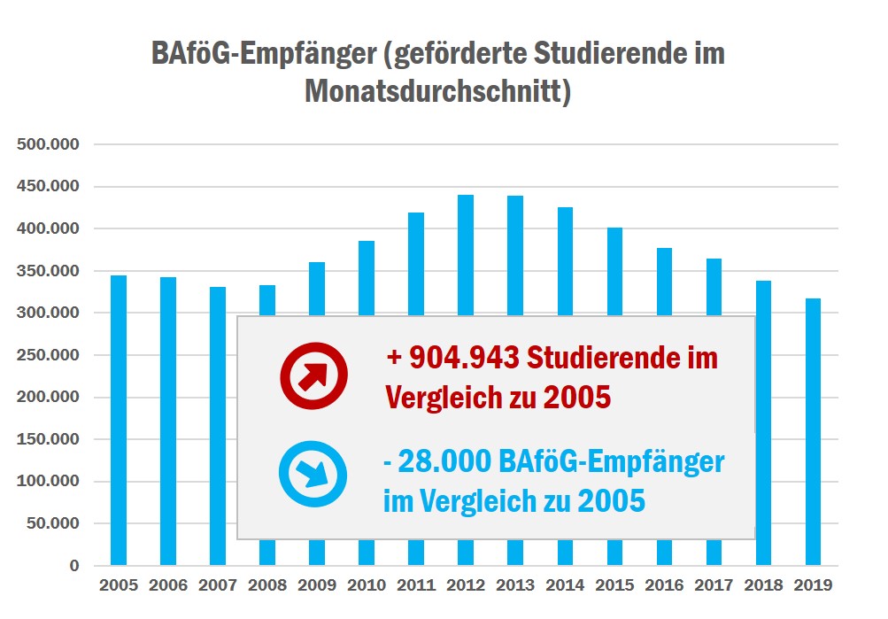 BAföG, Stipendien & Co.: Studienfinanzierung 2020 im CHECK 6. Oktober 2020 von Ulrich Müller CHECK, Corona, Hochschulfinanzierung, Pressemitteilungen, Studienfinanzierung, Studium & Lehre Die Zahl der Studierenden in Deutschland ist seit 2005 um fast eine Million gestiegen, die der BAföG-Empfängerinnen und -Empfänger aber gleichzeitig deutlich gesunken. Eine aktuelle CHE Publikation veranschaulicht die Entwicklung der wichtigsten Finanzquellen im Studium und zeigt den Handlungsbedarf im Bereich der Studienfinanzierung auf. Ungefähr 900 Euro benötigen Studierende im Durchschnitt pro Monat zur Finanzierung des Studiums. Sie greifen dazu auf unterschiedliche Finanzierungsquellen zurück. Der größte Anteil wird von den Eltern sowie durch Einkünfte aus Nebenjobs während des Studiums beigesteuert. Das 2019 leicht reformierte BAföG verliert als Baustein der Studienfinanzierung dagegen weiter an Bedeutung. Während die Zahl der Studierenden seit 2005 um 900.000 gestiegen ist, sank die Zahl der durch BAföG-geförderten Studierenden im gleichen Zeitraum sogar um rund 30.000. Damit lag der Anteil der BAföG-geförderten Personen an der Studierendenschaft nur noch bei 11 Prozent (17 % im Jahr 2005). Nur ein geringer Prozentsatz von jeweils einem Prozent nutzen ein Deutschlandstipendium, einen Studienkredit oder Stipendien eines Begabtenförderungswerkes. Entwicklung von Studierenden und BAföG-Empfängern seit 2005 Auch die vom Bund bereitgestellten Unterstützungsangebote für Studierende während der Corona-Pandemie überzeugen nur bedingt. Zwar wurden bis zum Einreichungsschluss der Überbrückungshilfe rund 135.00 monatsbezogene Anträge von Studierenden bewilligt, das veranschlagte Budget von 100 Millionen Euro allerdings bei Weitem nicht ausgeschöpft. „Die Erfahrungen in diesem Jahr zeigen, dass die etablierten staatlichen Instrumente der Studienfinanzierung weiter rapide an Bedeutung verlieren“ urteilt Ulrich Müller. „Studierende setzen selbst in Zeiten der Pandemie lieber auf Eigeninitiative und den familiären Notgroschen. Bestehende Einzelangebote und staatliche Notfall-Reaktionen erreichen den Großteil der Studierenden nicht mehr“, so der Experte für Studienfinanzierung beim CHE Centrum für Hochschulentwicklung. Das mache Bildungschancen zunehmend abhängig von positiven konjunkturellen Entwicklungen. Damit in Zukunft ein chancengerechter Hochschulzugang sichergestellt wird, plädiert das CHE für ein kohärentes System der Studienfinanzierung, das die einzelnen bisher unverbundenen Elemente bündelt und unterschiedliche Eventualitäten, Lebenslagen, Bildungsbiografien und Studienmodelle auffängt. „Ein erster Schritt einer solchen zeitgemäßen Studienfinanzierung müsste sein, auch Teilzeit- und weiterbildende Masterstudiengänge durch BAföG zu fördern“, so Müller. Über die Publikation Das CHE Format CHECK bietet seit 2019 einen schnellen – überwiegend visuellen – Überblick zu unterschiedlichen Themen. Für eine Darstellung der Fördermittel und deren Bedeutung für die Studienfinanzierung in Deutschland zum aktuellen Wintersemester 2020/21 hat das CHE aktuelle Daten aus verschiedenen Quellen zusammengestellt. Autoren der Publikation „CHECK – Studienfinanzierung in Deutschland 2020“ sind Ulrich Müller und Jan Thiemann. Sämtliche visuellen Inhalte stehen als Grafik in der CHE Flickr-Cloud online zur Verfügung. CHECK Studienfinanzierung in Deutschland 2020 6. Oktober 2020 290.42 KB 19422 downloads Müller, Ulrich; Thiemann, Jan: CHECK - Studienfinanzierung in Deutschland 2020,... Download