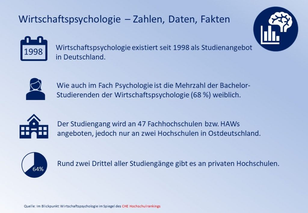Seit Mai 2020 gehört das Fach zum Kanon der 40 Fächer in Deutschland, die im CHE Hochschulranking berücksichtigt werden. Aus diesem Grund hat das CHE die wichtigsten Rankingergebnisse und weitere Daten zur Wirtschaftspsychologie in einer Publikation zusammengestellt.