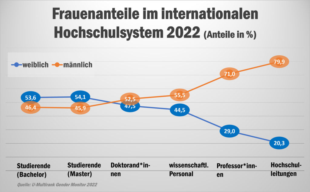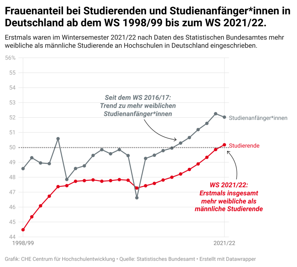 Foto: Brooke Cagle / Unsplash Erstmals mehr weibliche als männliche Studierende an deutschen Hochschulen 28. September 2022 von Gero Federkeil Hochschulsystem, Pressemitteilungen, Sonstiges, Studium & Lehre, U-Multirank Im Wintersemester 2021/22 waren erstmals mehr weibliche als männliche Studierende an deutschen Hochschulen eingeschrieben. Dieser Trend bestätigt sich auch international. Dies zeigen zwei aktuelle Auswertungen des CHE. Fächer wie Soziale Arbeit, Psychologie und Erziehungswissenschaft weisen dabei national und international jeweils die höchsten Frauenanteile von über 70 Prozent auf. Mit einem Anteil von 50,2 Prozent gab es im vergangenen Wintersemester 2021/22 erstmals mehr weibliche als männliche Studierende an deutschen Hochschulen. Insgesamt ist der Frauenanteil im Studium in den vergangenen rund dreißig Jahren angestiegen. Im Wintersemester 1998/99 lag er noch bei 44,5 Prozent. Seit 2016 dominierten bei den Studienanfänger*innen in jedem Jahr die weiblichen Erstsemester. Auch bei den bestandenen Abschlussprüfungen stellen die Absolventinnen mit 52,9 Prozent mittlerweile die Mehrheit im Geschlechtervergleich. Dies zeigt ein aktueller DatenCHECK des CHE Centrum für Hochschulentwicklung im Rahmen des neuen Portals Hochschuldaten.de. Den höchsten Studentinnenanteil im Ländervergleich weist Thüringen mit 59,5 Prozent auf. Dies ist jedoch auch auf die private IU internationale Hochschule zurückzuführen, deren Studierende größtenteils dem Hauptsitz in Erfurt zugerechnet werden. Die vier Studienfächer mit dem höchsten Frauenanteil unter den am stärksten nachgefragten Fächern sind Germanistik/Deutsch, Erziehungswissenschaft/Pädagogik, Soziale Arbeit und Psychologie. Hier sind jeweils mehr als drei Viertel aller Studierenden weiblich. Die nationalen Ergebnisse decken sich dabei weitgehend mit internationalen Trends. Dies zeigt der aktuelle U-Multirank Gender Monitor, der mit Daten aus dem internationalen Hochschulranking U-Multirank, an dem das CHE federführend beteiligt ist, bereits zum zweiten Mal veröffentlicht wurde. Die Auswertung von mehr als 2.200 Fachbereichen zeigt international einen Frauenanteil von jeweils 53,6 bzw. 54,1 Prozent bei den Bachelor- und Masterstudierenden. Die höchsten Quoten pro Fach weisen die Bereiche Pflegewissenschaft (83,3 %), Erziehungswissenschaft (82,1 %) und Soziale Arbeit (81,5 %) aus. Der Gender Monitor, den das U-Multirank-Team in diesem Jahr zum zweiten Mal durchgeführt hat, untersucht dabei auch das Geschlechterverhältnis auf allen Karrierestufen des internationalen Hochschulsystems. „Die berühmte gläserne Decke für Frauen in Führungspositionen lässt sich international auch an den Hochschulen feststellen. Während der Frauenanteil bei Doktorand*innen und beim akademischen Personal noch nahezu ausgeglichen ist, sinkt er bei Professuren und Hochschulleitungen auf 29 bzw. 20 Prozent“, bilanziert Gero Federkeil, Leiter internationale Rankings beim CHE. Auch hier findet sich der internationale Trend in den deutschen Daten wieder. Während der Professorinnen-Anteil mit 27 Prozent leicht unter dem internationalen Trend liegt, beträgt der Anteil weiblicher Hochschulleitungen an einer staatlichen Hochschule in Deutschland aktuell 24,9 Prozent. Der Geschlechtsbegriff umfasst mittlerweile auch nicht-binäre Kategorien, die im Rahmen der Datenerhebung von U-Multirank ebenfalls angegeben werden können. In den zugrunde liegenden Daten für die deutsche und internationale Auswertung konnte dies aufgrund der geringen Fallzahlen jedoch noch nicht berücksichtigt und allein nach den Kategorien Frauen und Männern ausgewertet werden. Über den Gender Monitor: Die Daten des U-Multirank Gender Monitors basieren auf einem Sample von rund 1.050 Hochschulen in 80 Ländern, die geschlechtsspezifische Daten auf mehreren Ebenen (Studierende, Absolvent*innen, Doktorand*innen, wissenschaftliches Personal, Professor*innen, Hochschulleitungen) zur Verfügung gestellt haben. Der aktuelle Gender Monitor 2022 enthält die aufbereiteten Daten für 25 Studienfächer. Die Daten stammen aus dem internationalen Hochschulranking U-Multirank, das seit 2014 existiert. U-Multirank Gender Monitor 2022 28. September 2022 1.52 MB 20358 downloads Federkeil, Gero; Friedhoff, Caroline: U-Multirank Gender Monitor 2022 - Gender disparities... Download Über den DatenCHECK auf Hochschuldaten.de: Der DatenCHECK des CHE beinhaltet eine kurze Auswertung sowie grafische Veranschaulichung der Ergebnisse zum Thema: Geschlechterverhältnis an deutschen Hochschulen. Grundlage sind Daten des Statistischen Bundesamtes sowie des CHECK Hochschulleitungen in Deutschland 2022. Sie bieten u.a. Daten zum Geschlechterverhältnis im Studium, aufgeschlüsselt nach Bundesländern, Fächern und Abschlussarten. Der Daten CHECK ist Teil des neuen Länderportals www.hochschuldaten.de, auf dem das CHE umfangreiche Hochschuldaten für alle 16 Bundesländer zur Verfügung stellt Link zum DatenCHECK: Geschlechterverhältnis an deutschen Hochschulen