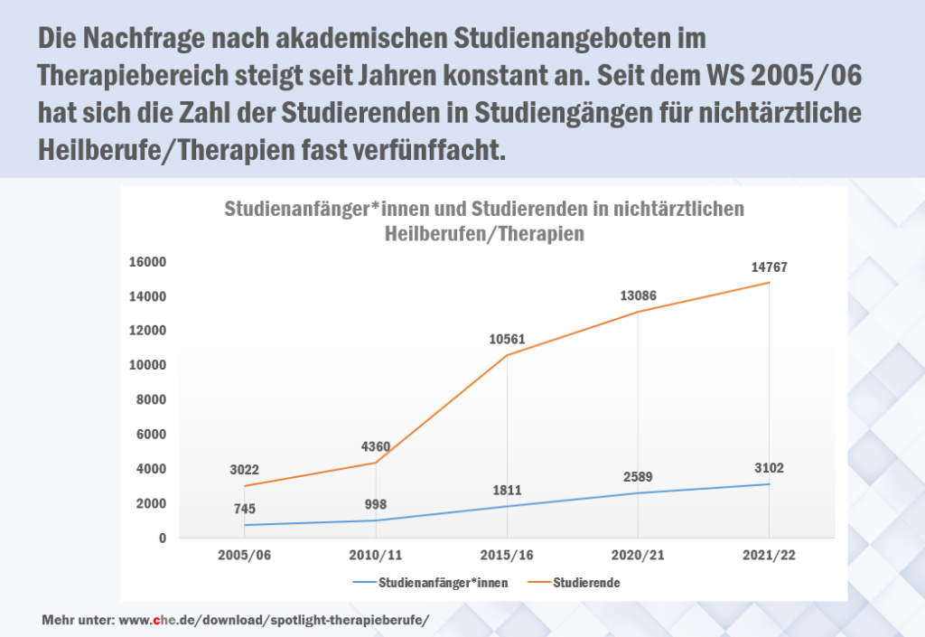 Foto: Shutterstock / Africa Studio Akademisierung der Therapieberufe: Deutschland droht, den Anschluss zu verlieren 17. Februar 2023 von Sigrun Nickel Duales Studium, Durchlässigkeit im Bildungssystem, Nachschulische Bildung, Pressemitteilungen International ist die akademische Ausbildung von Logopäd*innen, Ergo- und Physiotherapeut*innen mittlerweile Standard. Dagegen dominiert in Deutschland weiterhin die dreijährige Berufsausbildung an einer Berufsfachschule. Trotzdem hat sich mittlerweile eine Vielzahl von Studienangeboten für Therapieberufe an deutschen Hochschulen etabliert. Dies zeigt eine Auswertung des CHE Centrum für Hochschulentwicklung im Rahmen der Reihe „Spotlight“ in der aktuellen Ausgabe der Deutschen Universitätszeitung (DUZ). Am Beispiel der Schweiz zeigen die beiden Autorinnen, dass eine Vollakademisierung der drei Berufszweige gelingen kann, wenn es einen klaren politischen Willen zur Ausbildungsreform gibt. Die Hebammenausbildung erfolgt in Deutschland seit 2020 in Form eines praxisnahen Bachelorstudiums. Für die Therapieberufe fehlt jedoch weiterhin eine flächendeckende Lösung. Während international für Ergotherapie, Logopädie und Physiotherapie eine hochschulische Ausbildung seit Jahrzehnten Standard ist, gibt es in Deutschland weiterhin sowohl einen beruflichen als auch eine akademischen Ausbildungsweg. Eine Auswertung des CHE Centrum für Hochschulentwicklung im Rahmen eines Dossiers aus der Reihe DUZ Spotlight – Gute Praxis international zeigt für die bestehenden hochschulischen Angebote eine stark steigende Nachfrage. Zwischen den Wintersemestern 2005/2006 und 2021/2022 hat sich die Zahl der Studierenden in Studiengängen für nichtärztliche Heilberufe/Therapien fast verfünffacht. Aktuell sind in diesem Studienbereich rund 15.000 Studierende eingeschrieben. Für die Bereiche Ergotherapie, Logopädie und Physiotherapie gab es im vergangenen Jahr deutschlandweit 112 Studienangebote, die meisten davon in Nordrhein-Westfalen und Baden-Württemberg. Von diesen folgt fast die Hälfte einem dualen Ansatz und beinhaltet ein ausbildungsintegrierendes oder begleitendes Studium. 17 Studienangebote sind primärqualifizierend, d.h. die Berufsqualifizierung wird durch erfolgreiches Absolvieren eines Hochschulstudiums in Vollzeit erreicht. Eine separate Übersicht des CHE zeigt die jeweiligen Studienangebote für jedes Bundesland samt Standort. 70 Prozent der Studiengänge konzentrieren sich auf eines der drei Fächer, es gibt aber auch Angebote, die bis zu drei Fächer kombinieren. Fast drei Viertel aller Studiengänge werden von Fachhochschulen bzw. Hochschulen für angewandte Wissenschaften angeboten, die sich oftmals in privater Trägerschaft befinden. „Trotz der steigenden Nachfrage nach Studienangeboten verharrt man in Deutschland politisch bei der Ausbildungsreform in der Ergotherapie, Logopädie und Physiotherapie in einer unentschlossenen Zwischenposition. Seit rund 15 Jahren wird über die Akademisierung diskutiert, aber eine klare Richtungsentscheidung fehlt “, bilanziert Sigrun Nickel. „Die Stagnation dürfte dabei sicher auch finanzielle Gründe haben“, vermutet die Leiterin Hochschulforschung beim CHE. Schließlich würden sich bei einer Vollakademisierung Teile der Ausbildungskosten vom Gesundheitssektor auf die Länder als Träger der Hochschulen verlagern. Auch steigende Durchschnittsgehälter in den Therapieberufen bei einem akademischen Abschluss könnten als Kostentreiber gesehen und das Vorhaben deshalb entsprechend ausgebremst werden. Dass es auch anders geht, zeigen die Dossier-Autorinnen Sigrun Nickel und Anna-Lena Thiele am Beispiel der Schweiz. Trotz ähnlicher politischer Diskussionen und einem ebenfalls starken und anerkannten Ausbildungssystem, verlagerten die Eidgenoss*innen seit den 2000er Jahren die Ausbildung von Logopädie, Physio- und Ergotherapie sukzessive an die Hochschulen. Mittlerweile ist der Akademisierungsprozess dort vollständig abgeschlossen und die Nachfrage nach entsprechenden Studienplätzen wächst weiter. Der Schwerpunkt zum Thema ist am 17. Februar im Rahmen der Ausgabe 02/2023 der DUZ erschienen und wurde von Sigrun Nickel und Anna-Lena Thiele erstellt. Das Dossier ist die zwölfte Ausgabe des gemeinsam von CHE und DUZ Deutsche Universitätszeitung entwickelten Formats „DUZ Spotlight – Gute Praxis international“, das in loser Folge in der DUZ und auf www.che.de veröffentlicht wird. Bereits erschienen sind Spotlight-Dossiers zum österreichischen Modell der lebensbegleitenden Matrikelnummer (Ausgabe 09/2017), dem britischen Professional Doctorate (01/2018), dem niederländischen Lehrführerschein (08/18), der Transfergemeinschaft nach Schweizer Vorbild (12/2018), der Etablierung wissenschaftlicher Weiterbildungszertifikate in der Schweiz (11/2019), Instructional Designern im Hochschulbetrieb (02/2020), Lernräumen der Zukunft (08/2020), zu Sozialen Innovationen vom Campus (11/2020), zur Gewinnung internationaler Promovierender (06/2021) sowie gerechten Regelungen beim Hochschulzugang (09/21), zu internationalen Medizinstudiengängen in Südosteuropa (02/22) sowie zu neuen Studienmodellen gegen den IT-Fachkräftemangel (11/22). Alle Publikationen sind hier online abrufbar. DUZ Spotlight: Akademisierung der Therapieberufe 17. Februar 2023 1.77 MB 14081 downloads Nickel, Sigrun; Thiele, Anna-Lena: DUZ Spotlight - Gute Praxis International: Akademisierung... Download