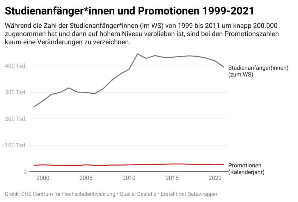 Foto: Michal Jarmoluk / Pixabay Chemie hat die höchste Promotionsquote aller Fächer 13. Januar 2023 von Cort-Denis Hachmeister DatenCHECK, Pressemitteilungen Im Fach Chemie gibt es fast so viele erfolgreiche Promotionen wie Masterabschlüsse. Die meisten Doktorarbeiten werden im Fach Medizin verfasst. Dies zeigt ein aktueller DatenCHECK des CHE Centrum für Hochschulentwicklung. Promotionen stellen den höchsten zu erlangenden Studienabschluss an deutschen Hochschulen dar. Laut Statistischem Bundesamt waren im Dezember 2021 rund 200.300 Menschen in Deutschland als Promovierende eingeschrieben. Die Zahl der 2021 erfolgreich abgeschlossenen Promotionen lag bei rund 28.000. Dies entspricht einem Plus von rund 2.000 im Vergleich zum stark durch Corona geprägten Jahr 2020. Im Vergleich zu der seit 2011 stark gestiegenen Zahl der Studienanfänger*innen bleibt die Anzahl der jährlichen Promotionen konstant. „Dass sich die Entwicklung der Studierendenzahlen nicht in mehr Doktorarbeiten niederschlägt, könnte an einem ‚Deckeneffekt‘ liegen“, so Cort-Denis Hachmeister. „Dies bedeutet, dass die Anzahl der Promotionsmöglichkeiten, insbesondere deren Finanzierung durch Stipendien oder Projektstellen, nicht im gleichen Umfang zugenommen hat wie die Anzahl der Studienplätze in den grundständigen Studiengängen“, erklärt der CHE Datenexperte. Eine weitere Erklärung könnte laut Hachmeister aber auch sein, dass sich die zusätzlichen Studienanfänger*innen nicht für Fächer entschieden haben, bzw. wegen Zulassungsbeschränkungen nicht studieren konnten, in denen besonders häufig promoviert wird. Zu diesen zählen die Medizin und die Naturwissenschaften, wie der aktuelle DatenCHECK des CHE verdeutlicht. Mehr als die Hälfte der im Schnitt 27.500 Promotionen pro Jahr entfällt bereits auf die Fächer Medizin/Zahnmedizin, Biologie, Chemie, Physik, Maschinenbau und Rechtswissenschaften. Spitzenreiter ist der Bereich Medizin mit im Mittel 6.832 jährlich abgeschlossenen Doktorarbeiten zwischen 2019 – 2021. Dahinter folgen mit deutlichem Abstand Biologie (2.125), Chemie (2.097) und Physik (1.625). Des Weiteren wurde für den DatenCHECK das Verhältnis zwischen der Zahl der abgeschlossenen Promotionen und der Anzahl zur Promotion qualifizierende Studienabschlüsse (Master, Diplom oder Staatsexamen, ohne Lehramt) an Universitäten untersucht. Hier nimmt die Chemie mit einer rechnerischen Promotionsquote von 85 Prozent eine Ausnahmestellung ein. In der Biologie entscheiden sich drei von vier Absolvent*innen für eine anschließende Promotion, in der Medizin noch gut zwei Drittel. In ingenieurwissenschaftlichen Fächern wie Maschinenbau/-wesen (25 %) oder Elektrotechnik (26 %) oder in den Sprach- und Kulturwissenschaften wie Geschichte (25 %) und Germanistik (16 %), jeweils ohne Lehramt-Studierende wird dagegen deutliche seltener promoviert. Bei den Promotionsquoten gilt es allerdings zu berücksichtigen, dass auch Promotionen von Personen, die zuvor im Ausland studiert haben mit einfließen. Gleiches gelte auch für fachfremde Promotionen. Weitere Daten zu Studienabschlüssen für Deutschland insgesamt sowie für die einzelnen Bundesländer finden sich im Portal CHE Hochschuldaten. Über den DatenCHECK auf Hochschuldaten.de: Der DatenCHECK des CHE beinhaltet eine kurze Auswertung sowie grafische Veranschaulichung der Ergebnisse zum Thema: Promotionen an deutschen Hochschulen. Grundlage sind Daten des Statistischen Bundesamtes. Cort-Denis Hachmeister ist Autor des DatenCHECK 1/2023 „Promotionen am häufigsten in Naturwissenschaften und Medizin“. Der DatenCHECK ist Teil des neuen Länderportals www.hochschuldaten.de, auf dem das CHE umfangreiche Hochschuldaten für alle 16 Bundesländer zur Verfügung stellt. DatenCHECK 1/2023: Promotionen am häufigsten in Naturwissenschaften und Medizin 13. Januar 2023 0.00 KB 11592 downloads Hachmeister, Cort-Denis: DatenCHECK 1/2023: Promotionen am häufigsten in Naturwissenschaften... Download