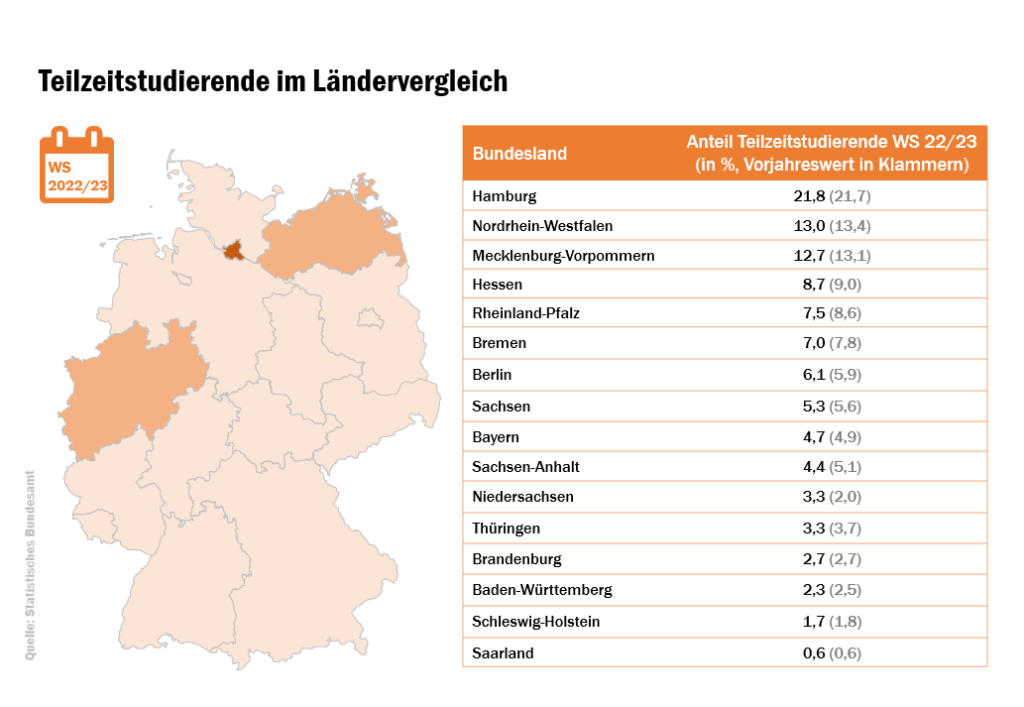 In der Länderauswertung des CHE weist Hamburg mit 21,8 Prozent die höchste Quote an Teilzeitstudierenden auf. An den Hochschulen des Stadtstaates absolviert etwa jede*r Fünfte das Studium nicht in Vollzeit. Allein fünf Hochschulen in der Hansestadt, darunter zwei Fernhochschulen, haben einen Anteil an Teilzeitstudierenden von mehr als 20 Prozent. Ebenfalls zweistellige Anteile können Nordrhein-Westfalen (13,0 %) und Mecklenburg-Vorpommern (12,7 %) vorweisen. Das Saarland hat mit rund 200 Teilzeitstudierenden die geringste Anzahl und mit 0,6 Prozent die niedrigste Quote im Ländervergleich.