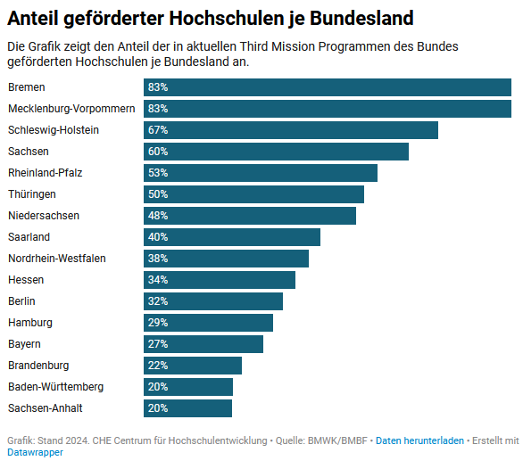 146 deutsche Hochschulen in Third-Mission-Förderlinien erfolgreich 24. Juni 2024 von Isabel Roessler DatenCHECK, Pressemitteilungen, Third Mission, Transfer Aktuell wird die Third Mission, also Aktivitäten der Hochschulen, die über die klassische Forschung und Lehre hinausgehen, in sechs Förderlinien durch den Bund unterstützt. Mit 146 Einrichtungen ist rund ein Drittel aller deutschen Hochschulen daran beteiligt. Die Universität Bremen ist die Hochschule mit den meisten Beteiligungen an Förderprogrammen im Third-Mission-Bereich. Den höchsten Anteil geförderter Hochschulen im Bundesland gibt es in Bremen und Mecklenburg-Vorpommern. Dies zeigt ein DatenCHECK des CHE Centrum für Hochschulentwicklung. Neben Lehre und Forschung wird die sogenannte Third Mission immer wichtiger. Sie umfasst Aktivitäten, die einen wechselseitigen Austausch der Hochschulen mit Wirtschaft, Gesellschaft und Politik beinhalten. Hierzu gehören ganz unterschiedliche Projekte, wie etwa Kooperationen mit Kommunen, Formate wie Citizen Science oder Gründungsförderung von Start-ups. Aktuell unterstützt die Bundespolitik Third-Mission-Maßnahmen im Rahmen von sechs unterschiedlichen Förderprogrammen. Hierzu zählen die Startup Factories, Innovationscommunities, Innovative Hochschule, T!Raum, WIR! sowie Gesellschaft der Ideen. Durch die Förderlinien werden insgesamt 146 Hochschulen und damit ein Drittel aller deutschen Hochschulen – ohne Universitätskliniken – unterstützt. Zwei weitere geförderte Hochschulen haben ihren Sitz in den Niederlanden. Dies zeigt eine Auswertung des CHE im Rahmen eines DatenCHECKs. Hierbei werden Hochschulen nicht nur berücksichtigt, wenn sie Hauptantragssteller sind, sondern auch, wenn sie als relevanter Partner in einem Antrag aufgeführt werden. Sämtliche Hochschulbeteiligungen an allen Förderlinien finden sich in interaktiven Karten auf dem Portal hochschuldaten.de. Die Universität Bremen weist mit fünf Beteiligungen in Third-Mission-Förderlinien bundesweit die meisten auf. Bei den Startup Factories ist die Universität Antragsstellerin, ebenso wie in zwei T!Raum Initiativen. Bei den Innovationscommunities gehört sie zwei Teams an. Nordrhein-Westfälische Hochschulen sind an insgesamt 36 Vorhaben in fünf der sechs ausgewerteten Förderlinien vertreten. In Sachsen werden 20 Vorhaben unter Beteiligung der dortigen Hochschulen durchgeführt. Berlin folgt mit 19 Projekten. Setzt man die Anzahl der geförderten Hochschulen ins Verhältnis zur Anzahl der Hochschulen im Bundesland insgesamt, dann weisen Bremen und Mecklenburg-Vorpommern die höchsten Anteile auf. In beiden Ländern erhalten 71 Prozent der Hochschulen eine Förderung des Bundes im Third-Mission-Bereich. „Die aktuellen Förderlinien des Bundes im Bereich Third Mission sind für Hochschulen von essenzieller Bedeutung“, bilanziert Isabel Roessler. „Als zentrale Akteure im Innovationsökosystem können sie einen direkten Mehrwert für die Gesellschaft schaffen und gleichzeitig die Bedeutung Deutschlands als Innovationsstandort festigen“, so die Expertin für den Bereich Third Mission beim CHE. Über den DatenCHECK auf Hochschuldaten.de: Der DatenCHECK des CHE beinhaltet eine kurze Auswertung sowie grafische Veranschaulichung der Ergebnisse zum Thema: In der Third-Mission-Förderung erfolgreiche Hochschulen. Grundlage ist eine Auswertung der Förderprogramme des Bundesministeriums für Bildung und Forschung sowie des Bundesministeriums für Wirtschaft und Klimaschutz durch das CHE (Stand Juni 2024). Isabel Roessler ist Autorin des DatenCHECK 3/2024 „Erfolgreiche Hochschulen in der Third-Mission-Förderung“. Der DatenCHECK ist Teil des Portals www.hochschuldaten.de, auf dem das CHE umfangreiche Hochschuldaten zur Verfügung stellt. DatenCHECK 3/2024: In der Third-Mission-Förderung erfolgreiche Hochschulen 24. Juni 2024 0.00 KB 6078 downloads Roessler, Isabel: DatenCHECK 3/2024: In der Third-Mission-Förderung erfolgreiche... Download Bildquelle: Adobe Stock