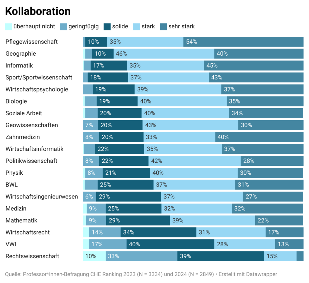 Future Skills: Problemlösekompetenz, kritisches Denken und Kollaboration halten Professor*innen für besonders wichtig 1. Oktober 2024 von Nina Horstmann DatenCHECK, Future Skills, Pressemitteilungen, Ranking Studierende brauchen für die Anforderungen der Arbeitswelt neue Kompetenzen. Inwieweit diese sogenannten Future Skills in der Lehre bereits gefördert werden, beleuchtet das CHE anhand einer Befragung von rund 6.400 Professor*innen für 19 Fächer an deutschen Hochschulen. Während einzelne Zukunftskompetenzen bereits in allen untersuchten Fächern etabliert sind, zeigen sich für den Großteil der untersuchten Kompetenzen noch deutliche Fächerunterschiede. So werden etwa Digitalkompetenzen in einigen Fächern noch kaum unterstützt. Dabei beurteilt die Mehrzahl der Professor*innen eine Vielzahl der untersuchten Future Skills als wichtig für die spätere Berufstätigkeit. Fachwissen allein reicht für die Arbeitswelt nicht mehr aus Megatrends wie Digitalisierung und Künstliche Intelligenz, aber auch globale gesellschaftliche Herausforderungen, haben weitreichende Auswirkungen auf die Arbeitswelt. Zur Bewältigung dieser Aufgaben werden sogenannte Future Skills immer wichtiger. Diese umfassen u.a. Kompetenzen zur Selbstorganisation, Innovation oder auch Resilienz. „Für die Arbeitswelt von heute und morgen reicht alleinige Fachkompetenz nicht mehr aus“, bilanziert Nina Horstmann. „Absolventinnen und Absolventen müssen später im Berufsleben heute noch unbekannte, komplexe Probleme in heterogenen Teams lösen und neue technologische Entwicklungen in ihren Berufsalltag integrieren können. Diese Kompetenzen sollten im Studium erlernt oder weiterentwickelt werden“, so die Expertin für Future Skills beim CHE Centrum für Hochschulentwicklung. Seit dem Wintersemester 2022/2023 untersucht das CHE deshalb bundesweit, inwieweit diese Kompetenzen an deutschen Hochschulen bereits gefördert werden. Mehr als 6.400 Professor*innen wurden zu 22 für den Arbeitsmarkt relevanten Future Skills in zwei Erhebungsrunden befragt. Die wichtigsten Future Skills aus Sicht der Professor*innen In der zweiten Befragungsrunde im vergangenen Wintersemester sollten Professor*innen von 11 der 19 untersuchten Fächer die Wichtigkeit einzelner Zukunftskompetenzen bewerten. Zu den wichtigsten Future Skills für die spätere Berufstätigkeit gehören nach Ansicht der deutschen Hochschulprofessor*innen aktuell: Problemlösekompetenz, kritisches Denken und Kollaboration. Die drei genannten Kompetenzen tauchten in allen untersuchten Fächern jeweils in den Top-5 pro Fach auf. Insgesamt zeigt sich aber auch für den Großteil der weiteren untersuchten Future Skills, dass die überwiegende Mehrzahl der Professor*innen diese als wichtig einschätzt. Im Vergleich zu den nicht-digitalen Kompetenzen werden die meisten Digitalkompetenzen allerdings bislang von einem geringeren Anteil an Professor*innen als wichtig bewertet. Die Aufbereitung der Ergebnisse in einem DatenCHECK im Portal hochschuldaten.de ermöglicht hierbei in interaktiven Grafiken sowohl eine Übersicht für einzelne Fächer sowie die Filterung nach einzelnen Future Skills im Fächervergleich. Deutliche Fächerunterschiede bei der Förderung von Future Skills – u.a. bei Kollaboration oder Digitalkompetenzen Neben der Relevanz beurteilten die Professor*innen auch den Umsetzungsstand bei der bisherigen Vermittlung der Kompetenzen in ihrem Fach. Nahezu flächendeckend stark gefördert werden dabei kritisches Denken, Problemlösekompetenz, Eigeninitiative, Urteilskompetenz, Selbstorganisationskompetenz und Lernkompetenz. Für einen Großteil der Future Skills gibt es jedoch deutliche Fächerunterschiede, beispielsweise bei der Kollaboration. Das gemeinsame Arbeiten an einer Aufgabe wird etwa im Bereich Pflegewissenschaft bereits in besonderem Maße in den Blick genommen. In den Rechtswissenschaften dagegen liegt der Anteil an Professor*innen, die Kollaboration besonders fördern, bei unter 20 Prozent. Abgesehen vom Studienfach Informatik werden Digitalkompetenzen im Vergleich zu nicht-digitalen Kompetenzen noch deutlich seltener gefördert. Hier sieht Studienleiterin Nina Horstmann den größten Aufholbedarf: „Inwieweit Künstliche Intelligenz unsere Lebens- und Arbeitswelt in den kommenden Jahren verändern wird, können wir bisher nur erahnen. Umso wichtiger ist es, die Studierenden auch beim Aufbau von KI- und Digitalkompetenzen, etwa Digitaler Ethik, durch innovative Lehrformate bereits jetzt bestmöglich zu unterstützen“. Insgesamt sei das Thema Future Skills in der deutschen Hochschullehre durchaus angekommen, so Horstmann. Zwischen der von den Professor*innen genannten Relevanz der einzelnen Future Skills und dem realen Umsetzungsstand in den Fächern gebe es aber zum Teil noch große Abweichungen. Über die Studie: Die Ergebnisse wurden im Rahmen des CHE Hochschulrankings 2023 und 2024 erhoben. Ausgewertet wurden Online-Befragungsergebnisse von rund 3.500 Professor*innen der rechts- und wirtschaftswissenschaftlichen Fächer sowie des Fachs Soziale Arbeit an deutschen Universitäten, Hochschulen für angewandte Wissenschaften bzw. Fachhochschulen und Dualen Hochschulen. Hinzu kommen Befragungen von 2.900 Professor*innen der mathematisch-naturwissenschaftlichen und medizinischen Fächer inklusive Pflege-, Politik- und Sportwissenschaft. Gefragt wurde in 19 unterschiedlichen Fächern nach der Förderung und Wichtigkeit von insgesamt 22 verschiedenen Future Skills. Die Befragungszeiträume waren im Wintersemester 2022/23 bzw. 23/24. Die erste Publikation „Bildung für die Zukunft? Förderung von Future Skills in der Hochschullehre“ erschien im Oktober 2023. Der aktuelle DatenCHECK 4/2024 „Future Skills in der Hochschullehre: Relevanz und Umsetzungsstand im Fächervergleich“ wurde auf dem Portal hochschuldaten.de veröffentlicht und enthält zahlreiche interaktive Grafiken. Nina Horstmann ist Autorin beider Veröffentlichungen. Date
