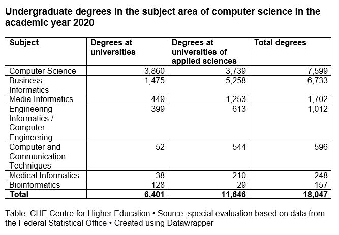 Software developers can also be trained in a completely different way 18. November 2022 by Jan Thiemann Hochschulzugang, Permeability in the Education System, Press releases, Studies & teaching Computer science is one of the most popular degree programmes in Germany. However, CHE’s latest DataCHECK on the area of computer science indicates low proportions of female students and low completion rates. These two aspects contribute to the inability to meet the demand for IT specialists in Germany. An article by CHE in the DUZ Spotlight series in the current issue of the DUZ magazine shows that software developers can also be trained in a completely different way. The focus is on the international programming school 42 and CODE University of Applied Sciences in Berlin. There is a skills shortage in the German IT industry. The industry association BITKOM, for example, stated that there were around 96,000 vacancies last year. According to the Bertelsmann Stiftung’s Jobmonitor, software developers are among the top 10 most sought-after professionals in Germany. Interestingly, computer science is the second most popular subject in Germany (around 138,000 students), trailing only business administration. And yet the current number of newly qualified IT graduates is nowhere near enough to meet the demand for skilled professionals. Reasons for this include the high computer science degree dropout rates and the low proportion of female students. These are the findings of the latest DataCHECK carried out by the CHE Hochschuldaten portal. As a result, of the 30,000 or so students who embark on a computer science degree each year (and who are in their first semester at university), only around 18,000 complete their undergraduate degree programme each year. These figures are consistent with previous studies on drop-out rates in this subject conducted by the German Centre for Higher Education Research and Science Studies. Another problem is the low proportion of female students. Currently, four out of five computer science students at German higher education institutions (HEIs) are male. This means that there is a lack of female IT role models on and off campus, resulting in the continued loss of many potential computer science specialists. A current CHE feature in the DUZ Spotlight series illustrates that software developers can be trained in a completely different way, both within and outside the higher education system. The article focuses on the examples of CODE University of Applied Sciences in Berlin, which places a strong emphasis on project-based learning and practice-related problems in the training of software developers, as well as the international programming school 42. École 42, a private, tuition-free programming school, was founded in Paris in 2013 by French internet entrepreneur Xavier Niel. Since then, the concept has spread worldwide, and there are now 42 campuses in 25 countries, including the recent additions of Wolfsburg, Heilbronn and Berlin. The 42 model dispenses with the need for formal application criteria such as a school-leaving certificate; what is more, there are no teachers. Given the small number of people who have so far graduated from these institutions, the author of the Spotlight dossier, Melisande Riefler, does not see either model as a comprehensive or quick solution to the shortage of IT experts. However, she does believe that they offer promising ideas for reforming the current study of computer science. These ideas include the greater use of aptitude tests instead of formal qualifications, better support of students during the induction period, and more flexible curricula and learning methods. The topic, addressed in the 11/2022 issue of DUZ on 18 November, was prepared by Melisande Riefler. The dossier “IT-Fachkräfte – selbstgemachte Mangelware” (IT professionals – a home-grown shortage) is the eleventh issue of the “DUZ Spotlight – Gute Praxis international” format, developed collaboratively by CHE and DUZ, which is published occasionally in DUZ and at www.che.de. Previous issues of the Spotlight dossier have explored the Austrian model of the lifelong student ID (09/2017 issue), the British professional doctorate (01/2018), the Dutch University Teaching Qualification (08/18), the transfer community based on the Swiss model (12/2018), the establishment of academic continuing education certificates in Switzerland (11/2019), instructional designers in university operations (02/2020), learning spaces of the future (08/2020), social innovation on campus (11/2020), the recruitment of international doctoral researchers (06/2021), fair rules for access to higher education (09/21) and international medicine degree programmes in Southeast Europe (02/22). All publications are available online here. The DataCHECK 03/2022 Informatik: Mehr Studienabschlüsse und mehr weibliche Studierende nötig (Computer science: More degrees and more female students needed) was written by Cort-Denis Hachmeister. Further brief analyses and extensive data material on the German higher education system at the national and state level can be found at www.hochschuldaten.de DatenCHECK 3/2022: Informatik: Mehr Studienabschlüsse und mehr weibliche Studierende nötig 18. November 2022 0.00 KB 22240 downloads Hachmeister, Cort-Denis: DatenCHECK 3/2022: Informatik: Mehr Studienabschlüsse und... Download